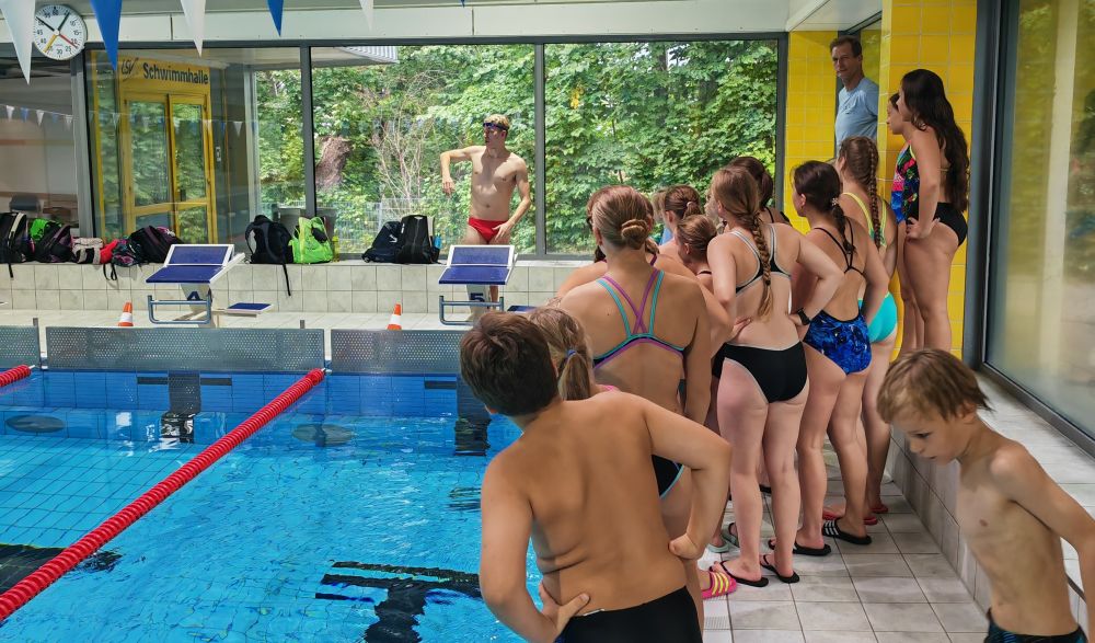 Nach dieser lebhaften Fragerunde ging es direkt ins Schwimmbecken. Dort gab Sven den Nachwuchsschwimmern eine wertvolle Technikstunde. Zunächst erklärte er präzise, worauf es bei den einzelnen Übungen ankommt, und demonstrierte anschließend, wie diese richtig auszuführen sind. Die Kinder waren mit Begeisterung dabei und versuchten, die Tipps und Tricks des Weltklasse-Athleten umzusetzen.