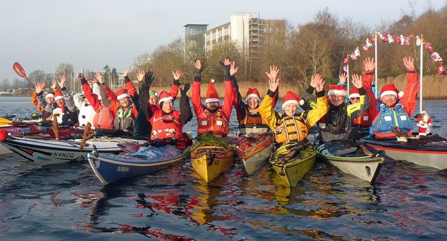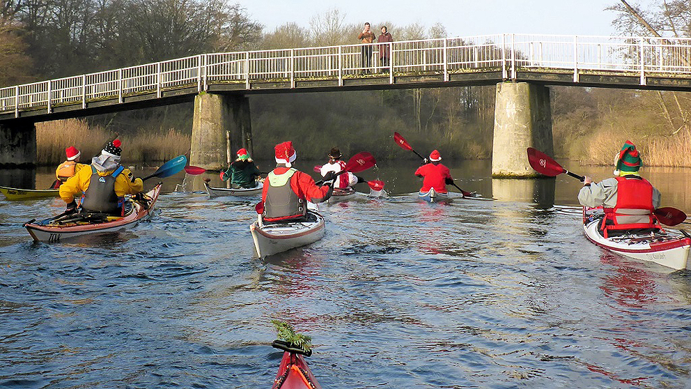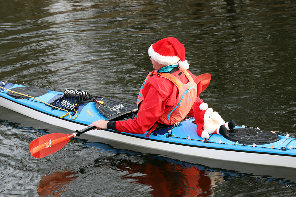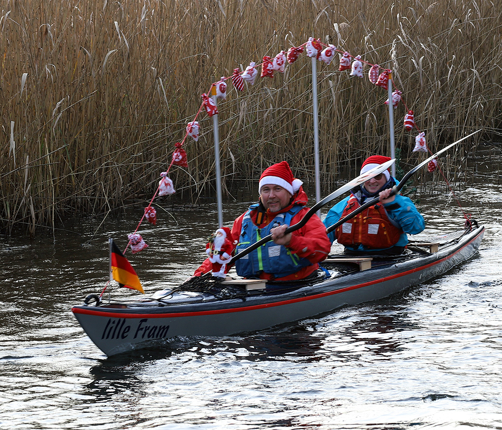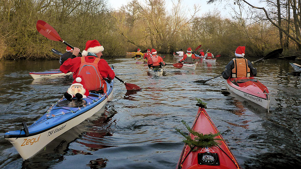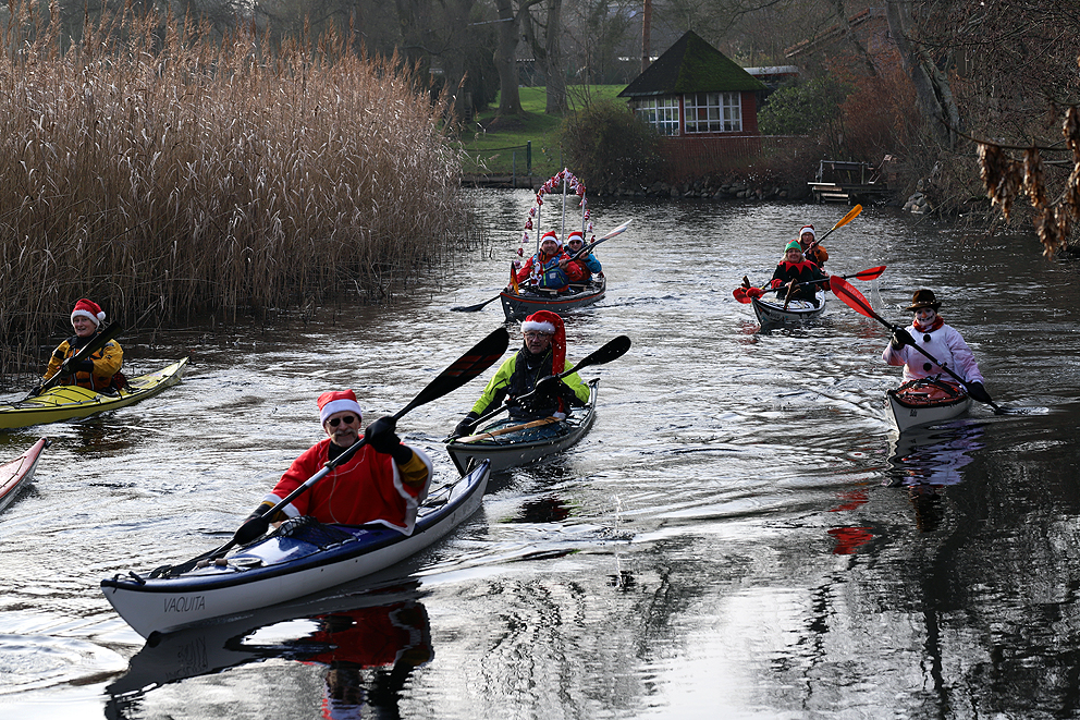 Mit geschmückten Booten und im weihnachtlichen Kostüm geht es die Schwentine abwärts in Richtung Förde