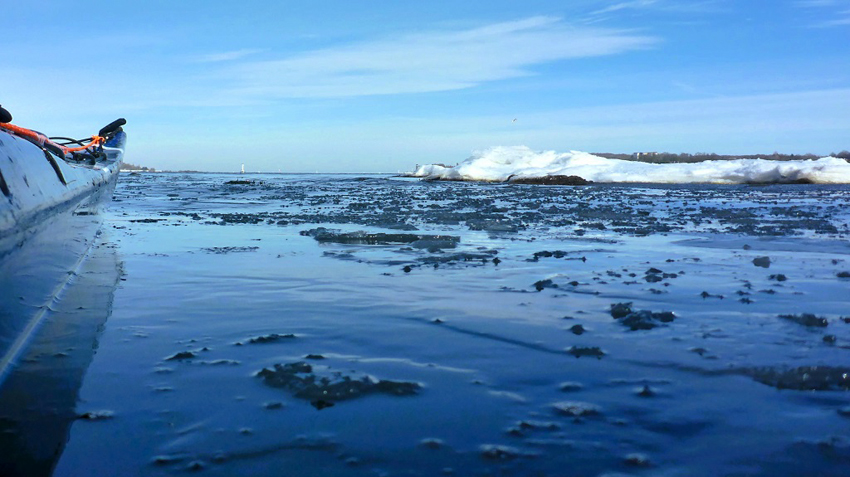 Eisberg voraus! Auf dem Ostufer der Förde war heute relativ viel Eis. Die Ränder der Buchten waren gefroren und der Südostwind trieb Eisstücke zusammen. Man muss schon ein wenig darauf achten wo man fährt. Sehr schön, aber auch spannend.